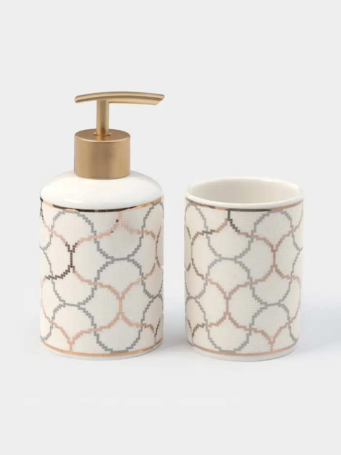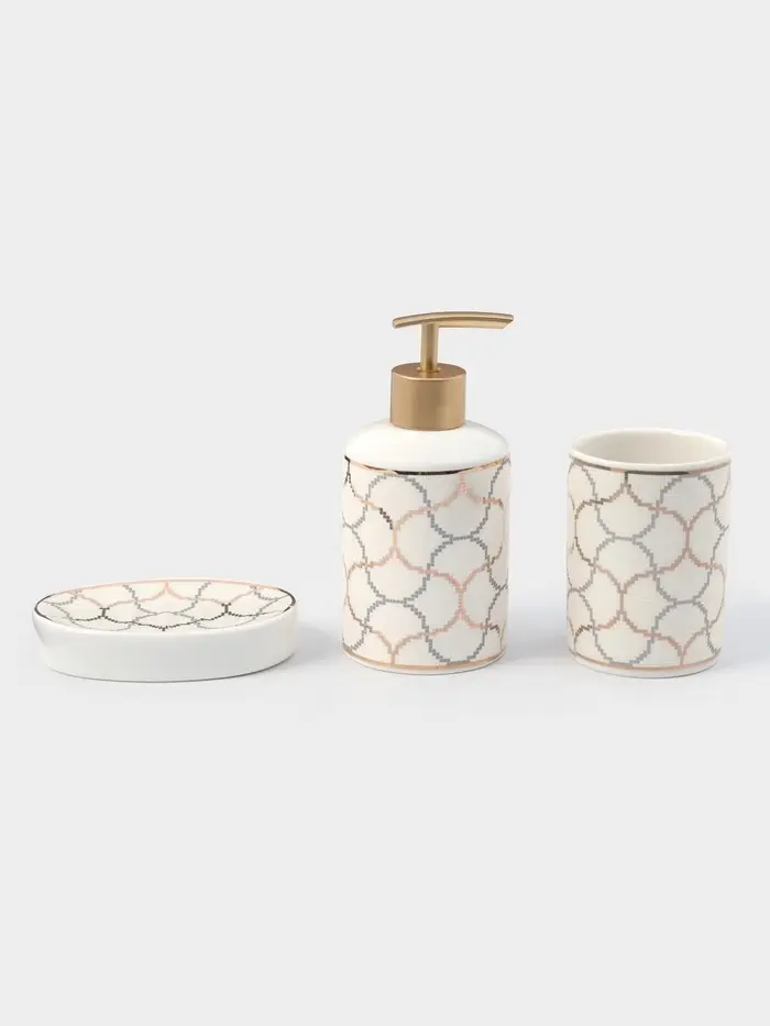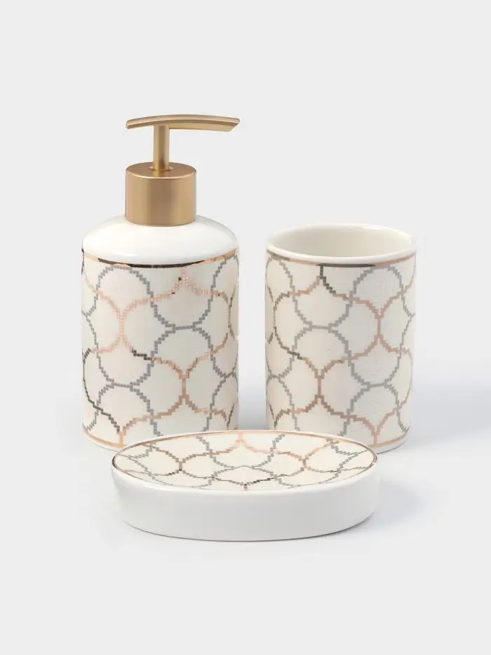 Набор аксессуаров организует пространство и станет стильным украшением Вашей ванной комнаты. За счет сдержанного дизайна данный керамический набор в ванную подойдет к любому дизайну ванной комнаты. Набор состоит из 3 предметов: дозатор, мыльница, стакан.