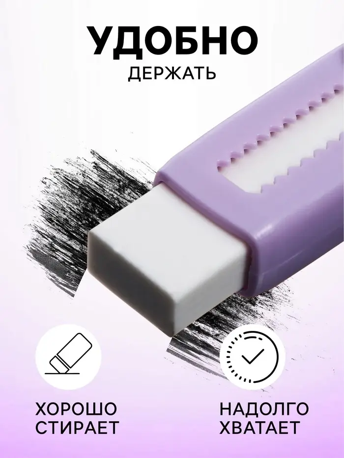 Ластик обеспечит лёгкое и чистое стирание без повреждения поверхности бумаги и без образования бумажной пыли.