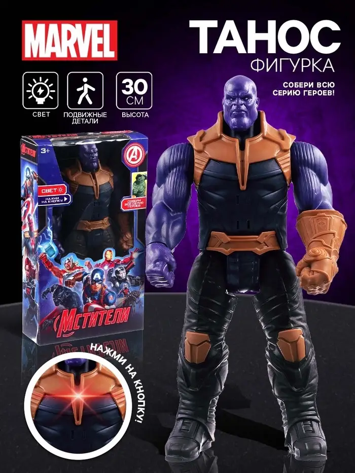Встретьтесь лицом к лицу с Таносом — самым мощным и грозным злодеем во вселенной Marvel! Этот колосс в бронированном костюме и с пугающей силой способен сразить любого противника. Светящийся элемент на груди и подвижные руки делают Таноса ещё более реалистичным, превращая каждую игру в эпическое сражение за судьбу Вселенной. С этим величественным врагом можно разыгрывать самые грандиозные битвы добра и зла!