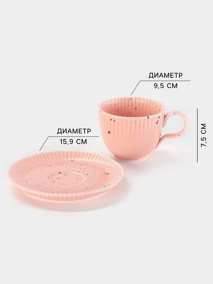 - Элегантный дизайн: нежный розовый цвет и стильная форма кружки и блюдца добавляют изысканности вашему столу.