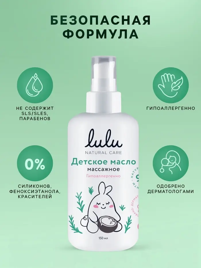 Детское масло массажное LULU является полностью гипоаллергенным, имеет крайне сбалансированный состав под потребности детской кожи, помогает сохранить здоровье и красоту кожи Вашего ребёнка.