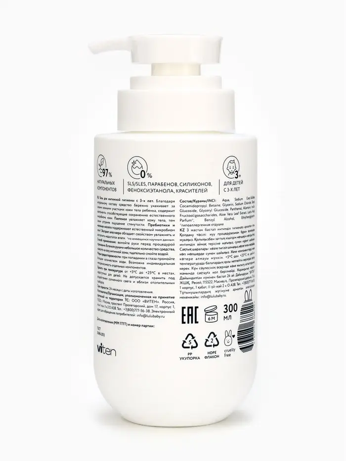 Мы в Лулу внимательно относимся к средствам для купания и гель для подмывания детский 3 + не исключение, он не содержит вредных химических веществ, парабенов, сульфатов и красителей. Благодаря этому средство для купания детское является полностью безопасным для чувствительной кожи малышей, а также гель для подмывания имеет гипоаллергенные свойства и предотвращает риск возникновения аллергических реакций.