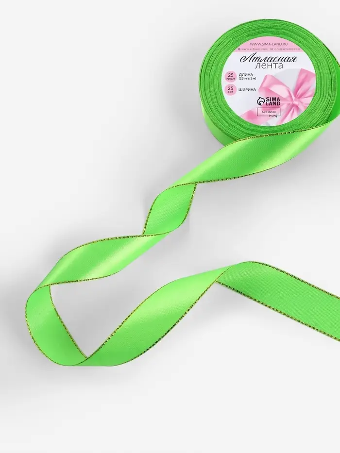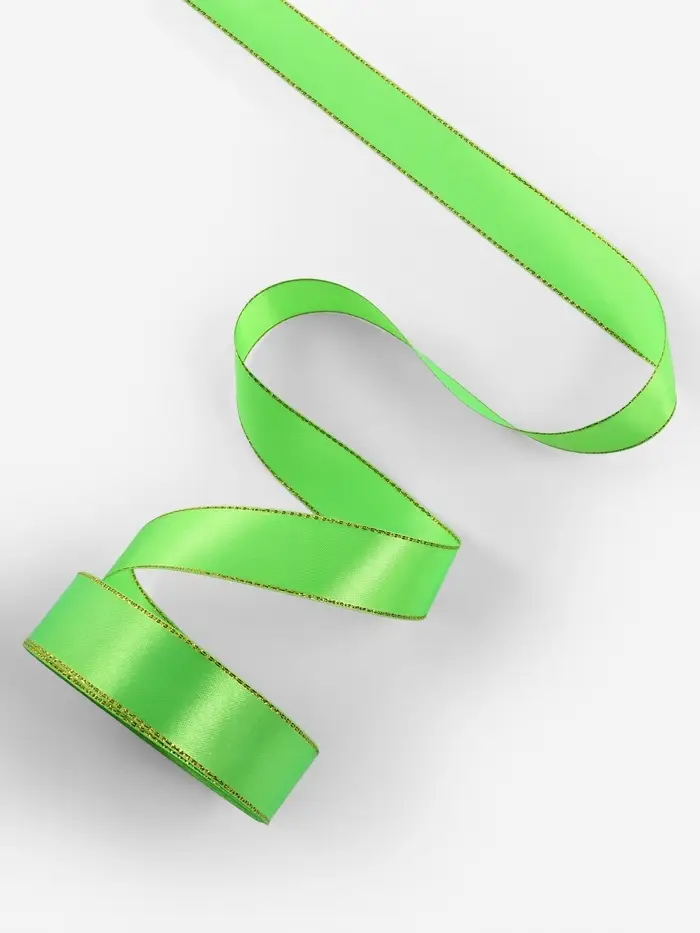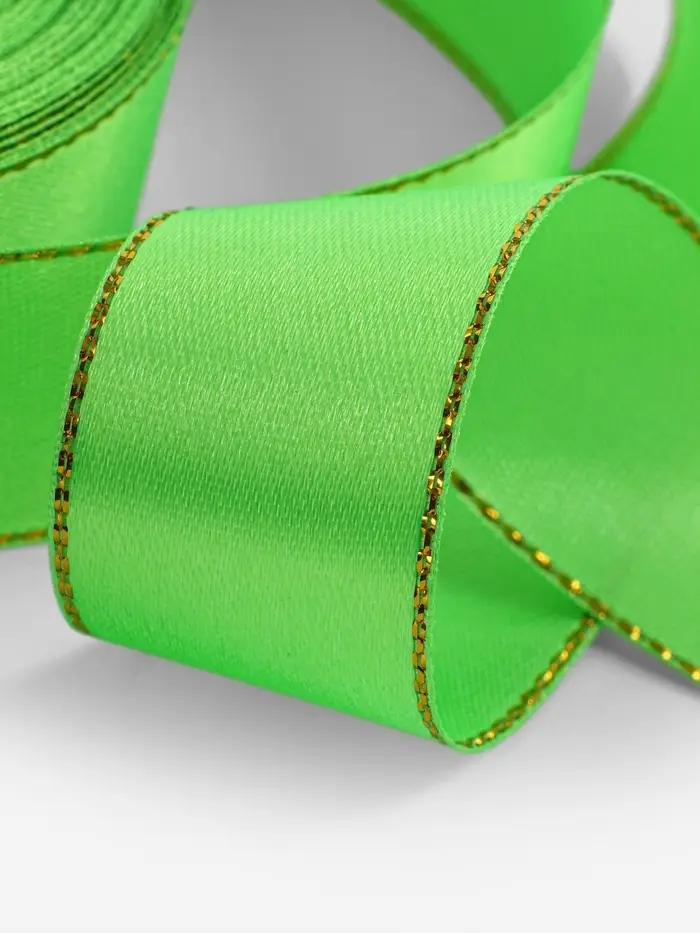 Ярко-зелёная атласная лента с золотым люрексом станет прекрасным выбором для декорирования, упаковки подарков и различных творческих проектов. Ее насыщенный зелёный цвет и изысканный золотой люрекс добавят особое очарование вашим изделиям и займут центральное место среди ваших декоративных элементов.