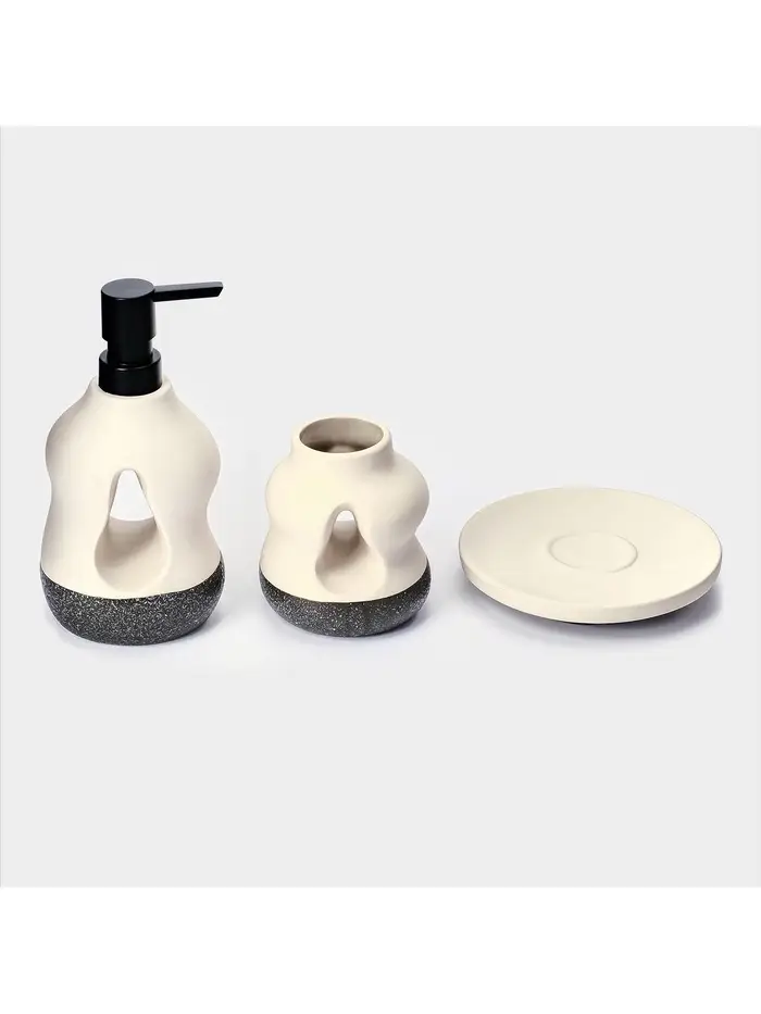 Каждый предмет набора изготовлен из высококачественной керамики, что гарантирует долговечность и устойчивость к воздействию влаги. Простота и лаконичность дизайна подчеркивают современный подход к оформлению пространства, делая его универсальным для различных стилей.