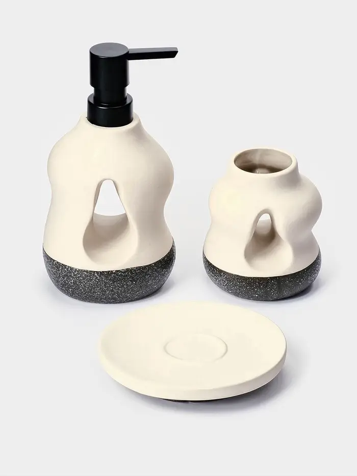 - Эстетика и практичность: дозатор для мыла, стакан и мыльница объединены в единый стиль, создавая гармоничный ансамбль.