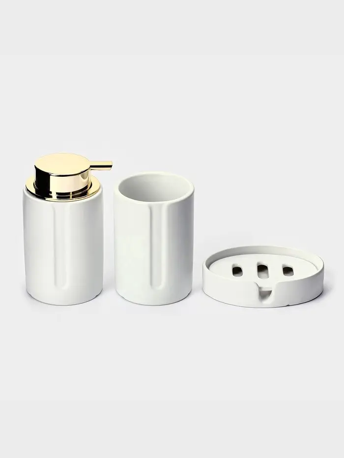 Набор для ванной из трёх предметов в белом цвете — это элегантное и практичное решение для вашей ванной комнаты. Комплект включает всё необходимое для поддержания порядка и стиля: дозатор для мыла, стакан и мыльницу. Изготовленные из керамики, эти аксессуары сочетают в себе долговечность и эстетику, делая их идеальным выбором для современного интерьера.