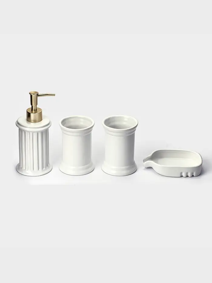 Преобразите вашу ванную комнату с элегантным набором, который сочетает в себе стиль и функциональность. Этот комплект из четырёх предметов, выполненный в классическом белом цвете, привнесёт в интерьер нотку утончённости и гармонии. Каждый элемент набора — дозатор для мыла, два стакана и мыльница — изготовлен из высококачественной керамики, что гарантирует долговечность и устойчивость к внешним воздействиям.