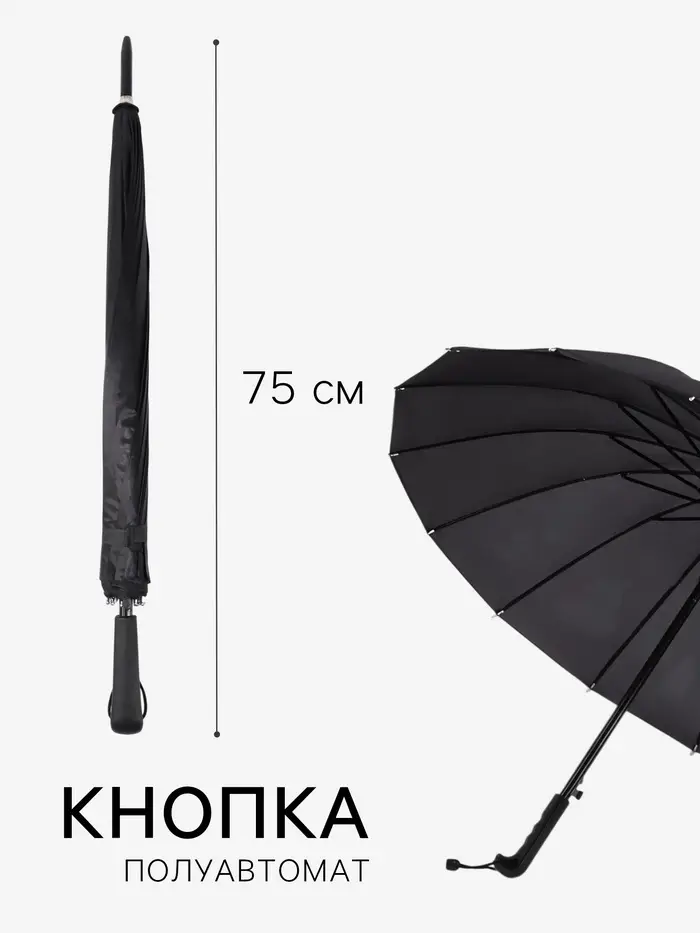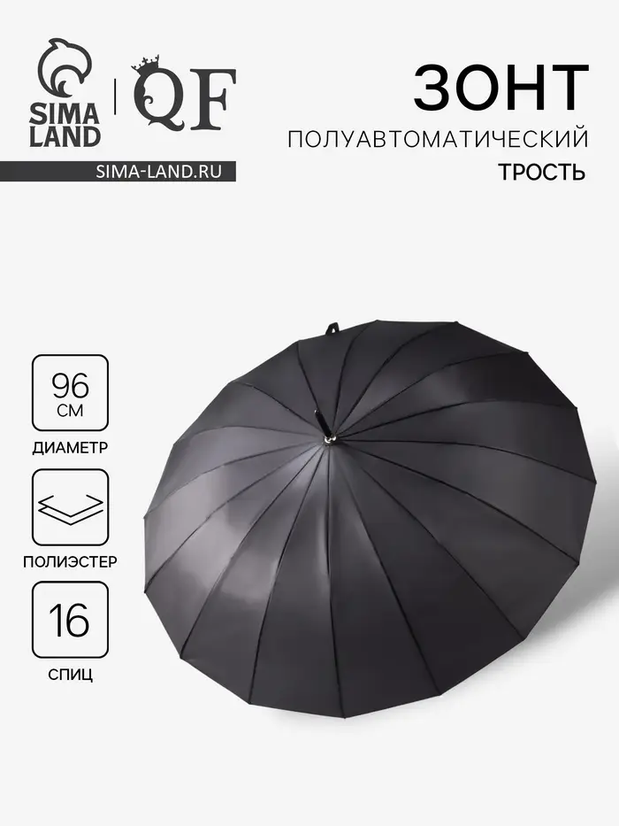 Зонт - трость полуавтоматический «Однотонный», 16 спиц, R=48/55 см, d=96 см, чёрный
