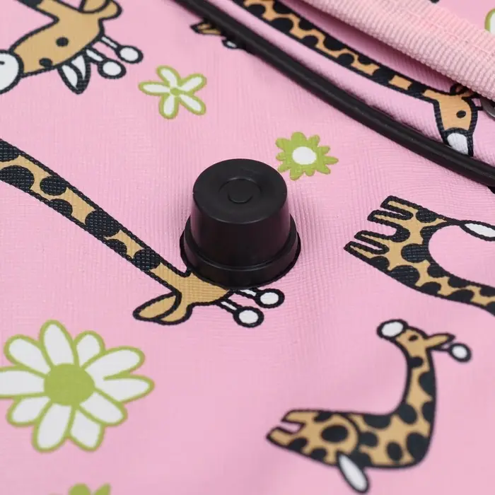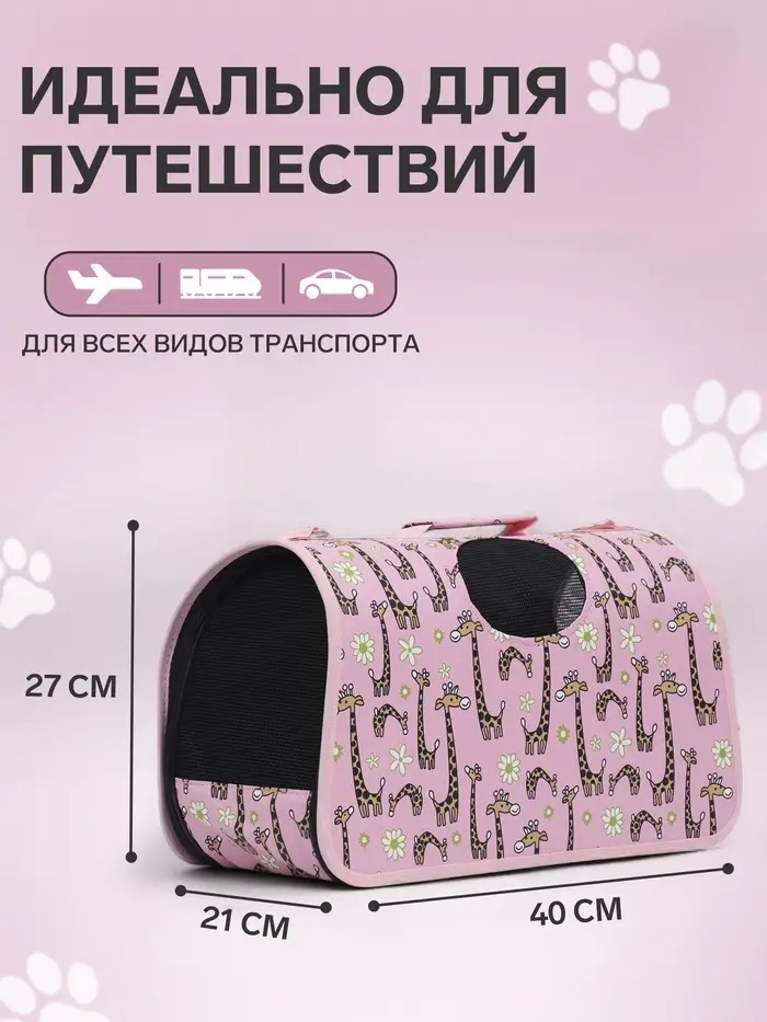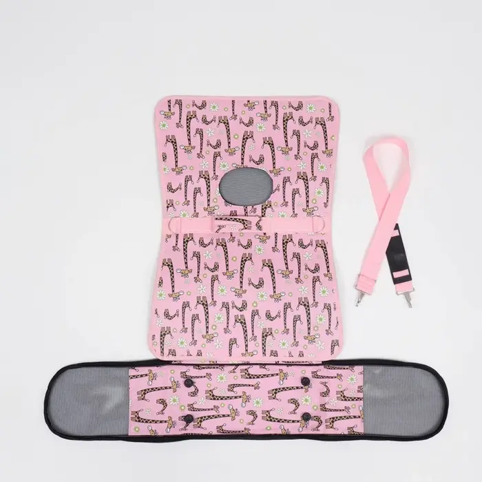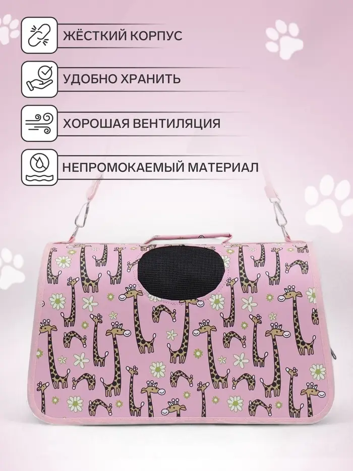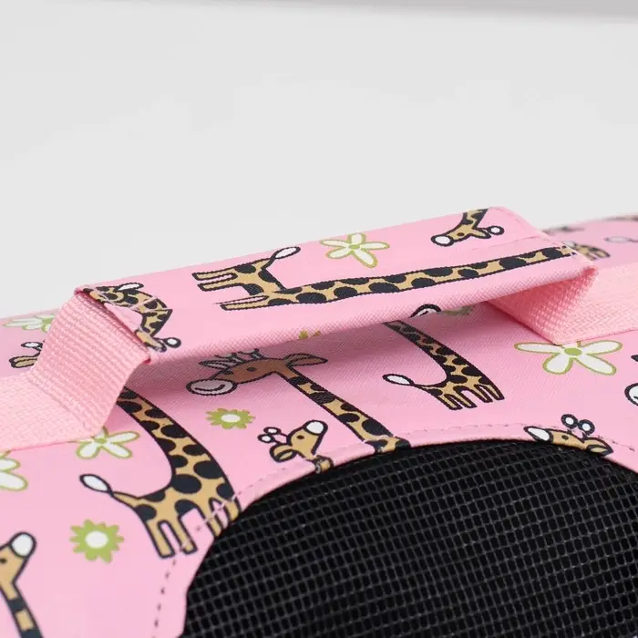 - Яркий розовый цвет и рисунок жирафов делают переноску стильным аксессуаром.