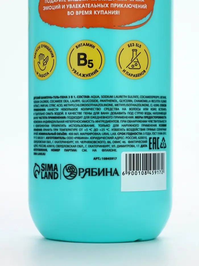 Состав: Aqua, Sodium Laureth Sulfate, Cocamidopropyl Betaine, Sodium Chloride, Cocamide DEA, Lauryl Glucoside, Panthenol, Glycerin, Chamomilla Recutita Flower Extract, Parfum, Citric Acid, Methylchloroisothiazolinone, Methylisothiazolinone, CL 42090