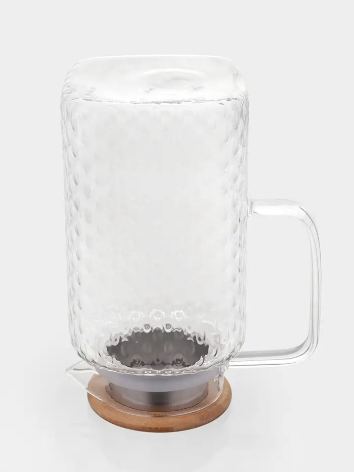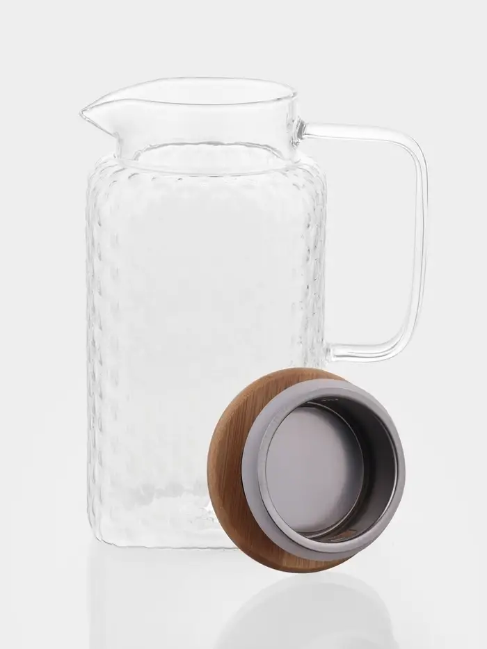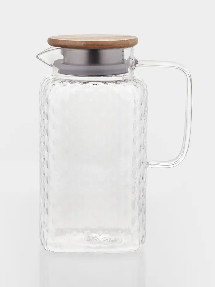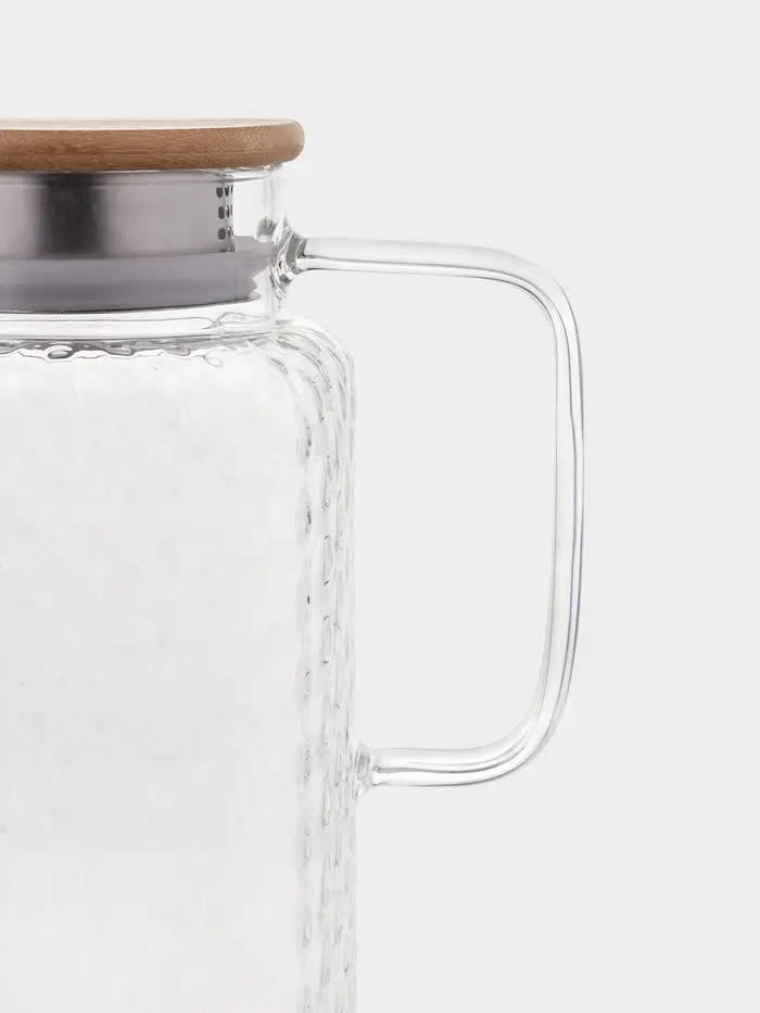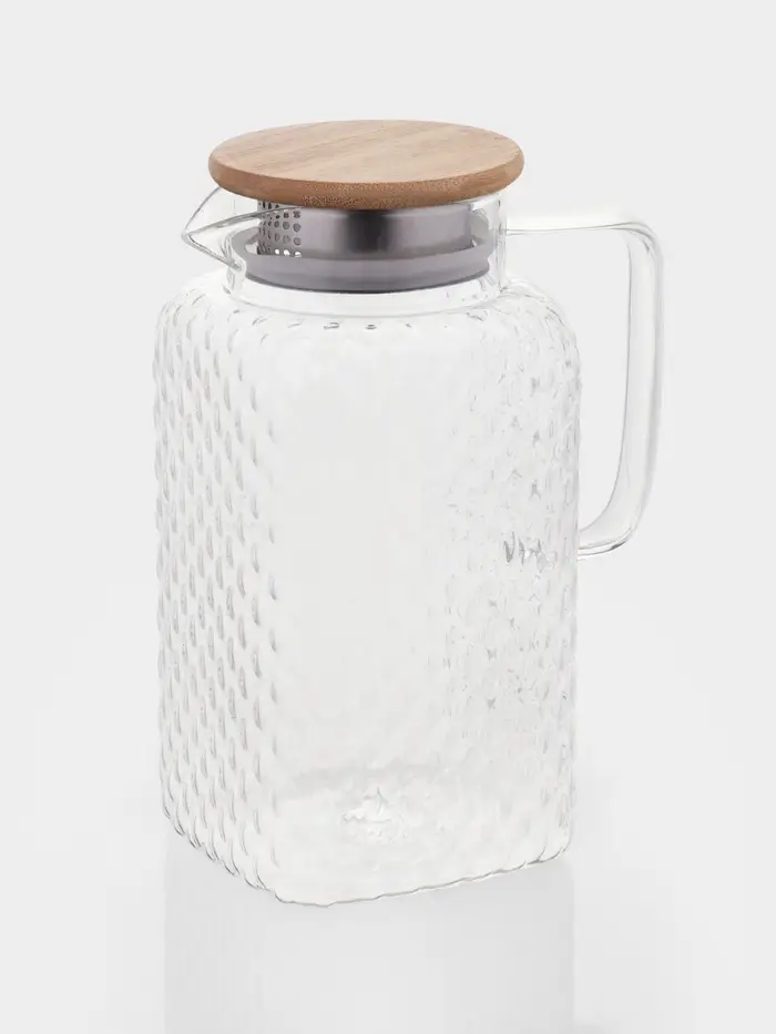 Кувшин для воды, чая, лимонада, морса, прохладительных и горячих напитков станет оригинальным украшением вашего стола. Фактурное стекло выглядит эффектно, а бамбуковая крышка оснащена фильтром, чтобы ягоды, фрукты и другие ингредиенты не попали в бокалы. Вы можете использовать данную модель как для холодных, так и для согревающих напитков.