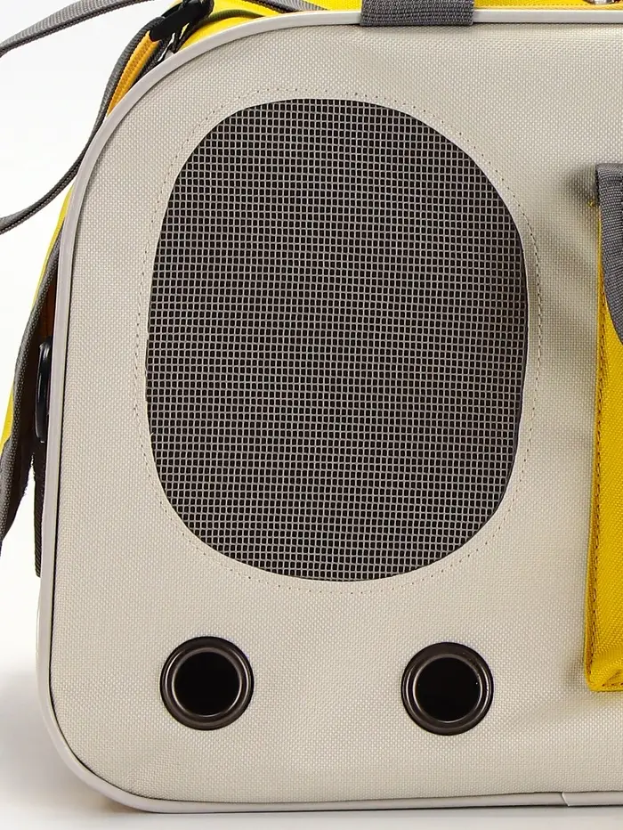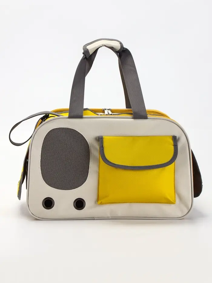 Сумка-переноска сочетает в себе практичность и эстетику. Её размеры (45×26×29 см) и нагрузка до 5 кг подходят для небольших и средних питомцев. Бело-жёлтая расцветка добавляет яркости, а органайзер и сетчатое окно делают её удобной как для владельца, так и для животного.