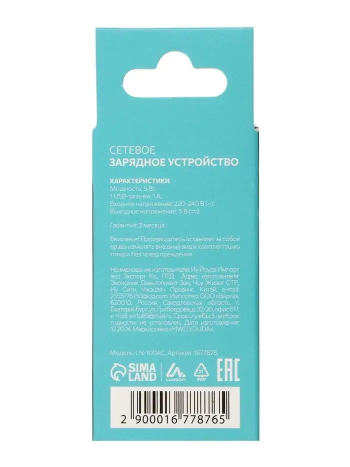 Сетевое зарядное устройство Luazon LPA-18, USB, 1 А, чёрное