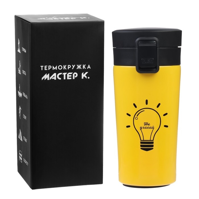 Термокружка для кофе и чая "Мастер К" идеальна для офиса, автомобиля, длительных прогулок и детям в школу. Благодаря специальному покрытию надежно лежит в руке.