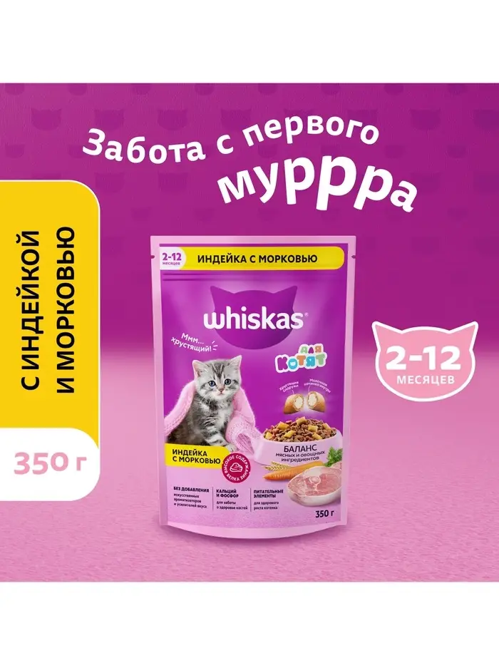 Сухой корм Whiskas для котят, индейка/морковь/молоко, подушечки, 350 г