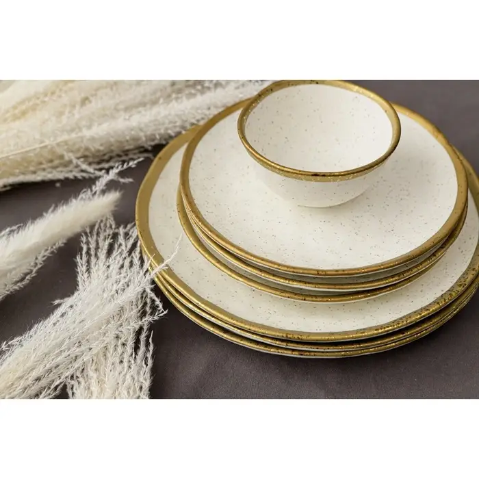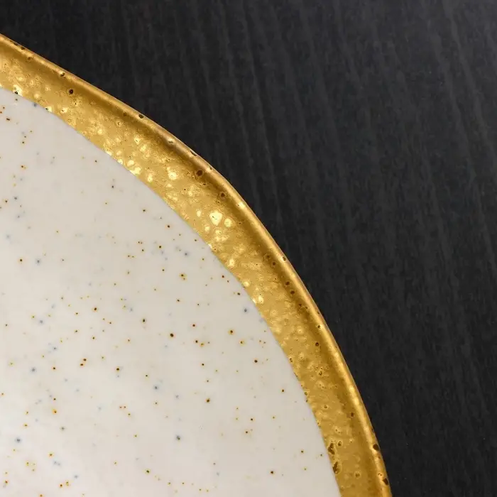 Посуда серии Magistro Poursephona — это современная фарфоровая посуда. В оформлении серии превалируют два цвета – бежевый оттенок фарфора и роскошное золото в виде широкой окантовки предметов. Идеально подходит как для формального обеда, так и для торжеств по особым случаям. Лаконичные формы, золотая окантовка, разноцветные вкрапления придают изделиям из фарфора одновременно необычный и современный вид.