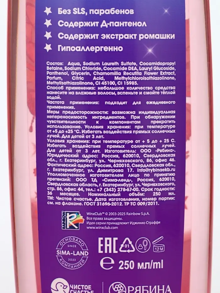 Детский шампунь для волос, аромат: тутти-фрутти, 250 мл, «Винкс»
