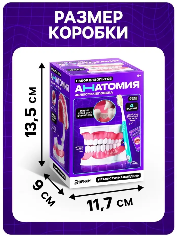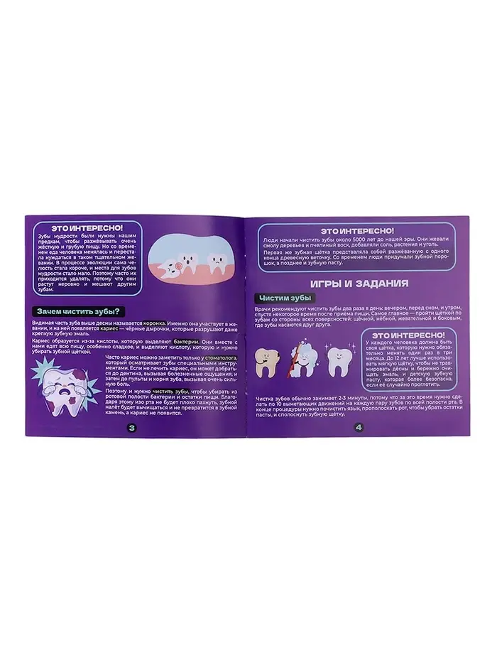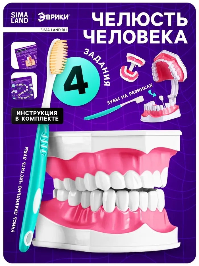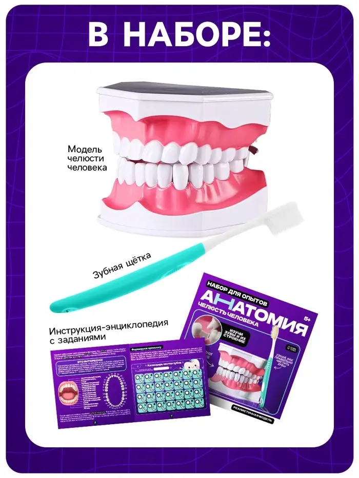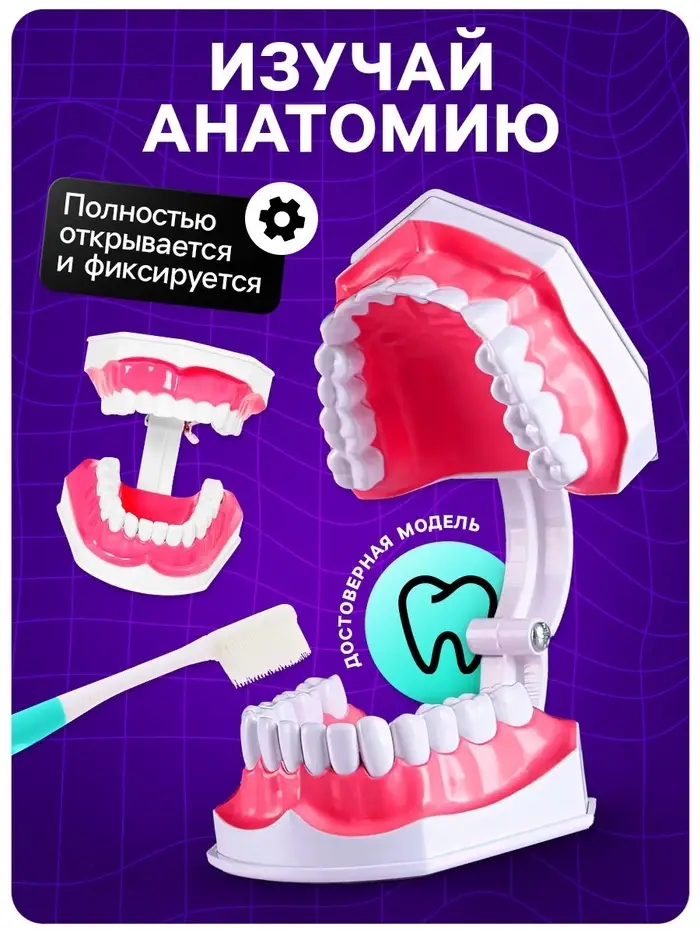 - Игровое изучение анатомии: Ребёнок узнает, как устроены зубы, чем отличается верхняя и нижняя челюсть и почему важно заботиться о здоровье полости рта.