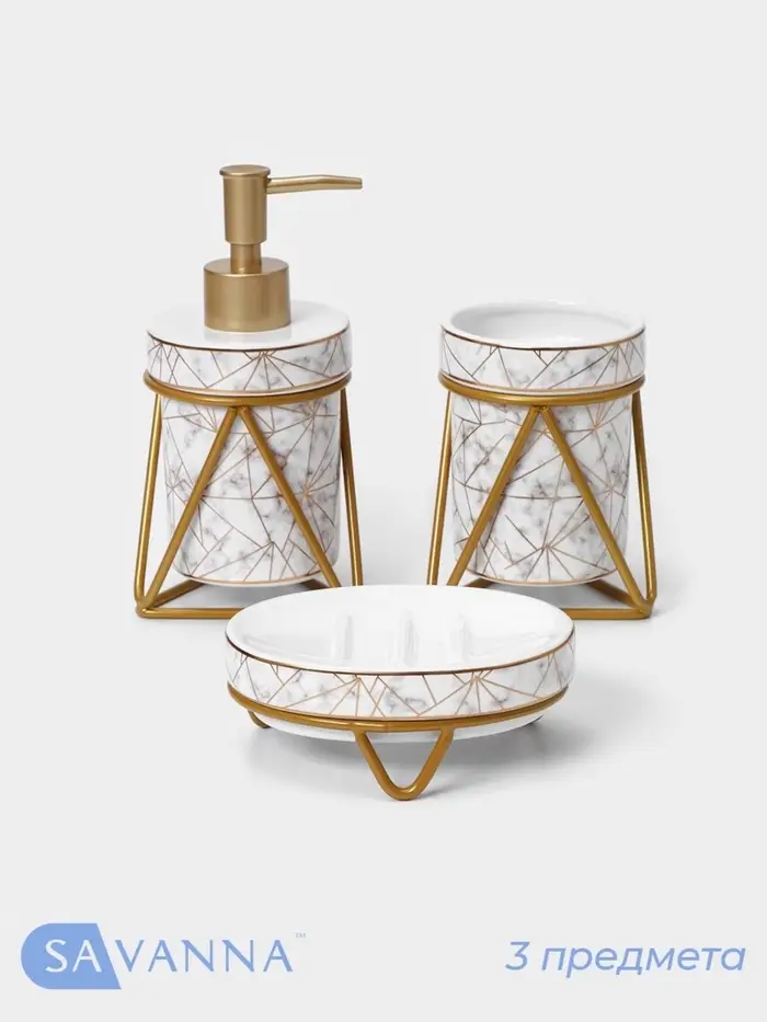 Аксессуары для ванной SAVANNA «Геометрика», 3 предмета, мыльница, дозатор для мыла 290 мл, стакан, белые