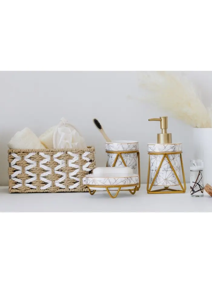 Превратите вашу ванную комнату в оазис стиля и современности с элегантными аксессуарами, которые воплотят в себе утонченность и практичность. Этот набор из трех предметов — мыльница, дозатор для мыла объемом 290 мл и стакан — выполнен в безупречном белом цвете с легким мраморным рисунком, что добавляет пространству нотку изысканности.
