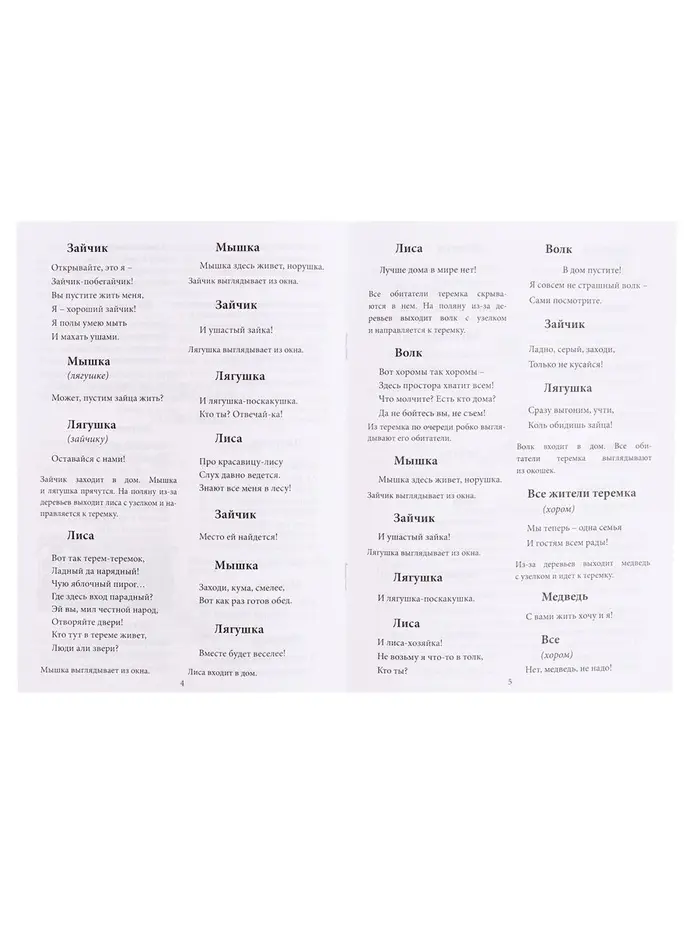 - Сценарий в стихах помогает детям запомнить сюжет, развивает память и учит выразительности. Персонажи – мышка, лягушка, заяц, лиса, волк и медведь – полностью соответствуют оригинальной истории.