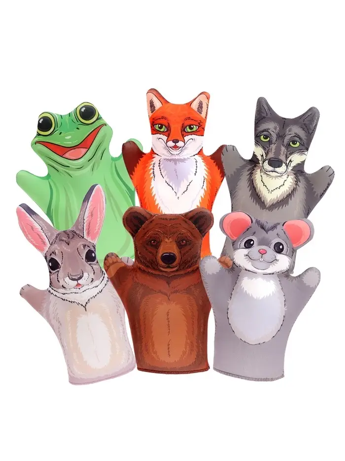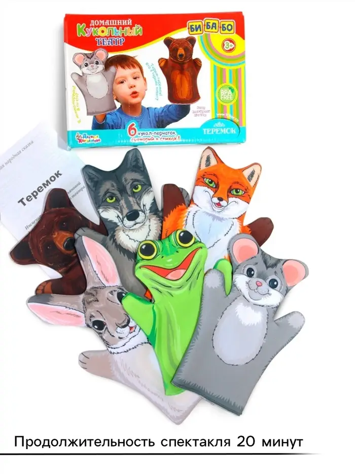 - Размер куклы-перчатки: 25 × 18 см. Куклы надеваются на руку и подходят для детской ладони и взрослой руки. Благодаря этому родители смогут разыгрывать сказку вместе с ребёнком, делая игру ещё более интересной.