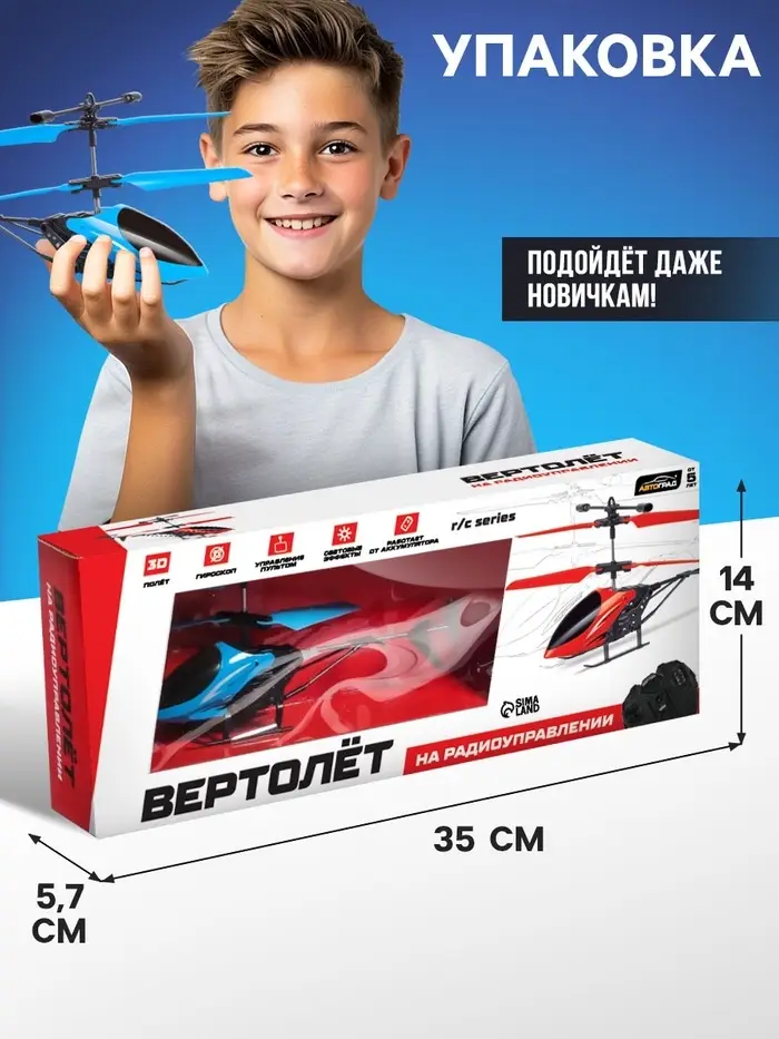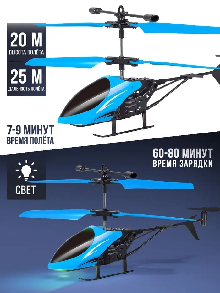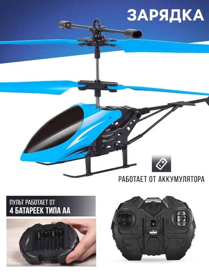 - Вертолёт работает от аккумулятора и заряжается от пульта управления.