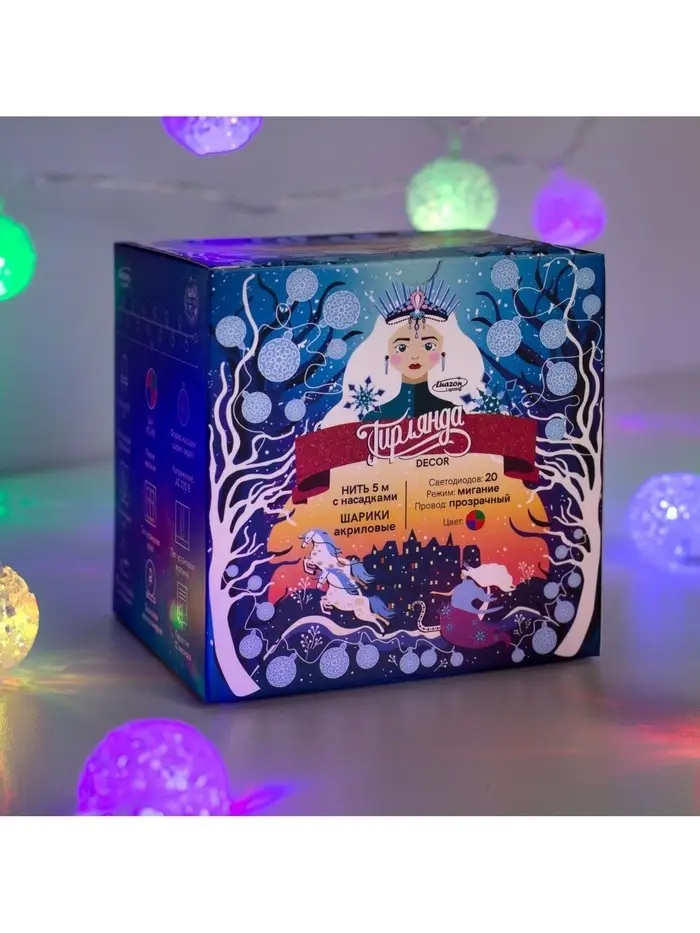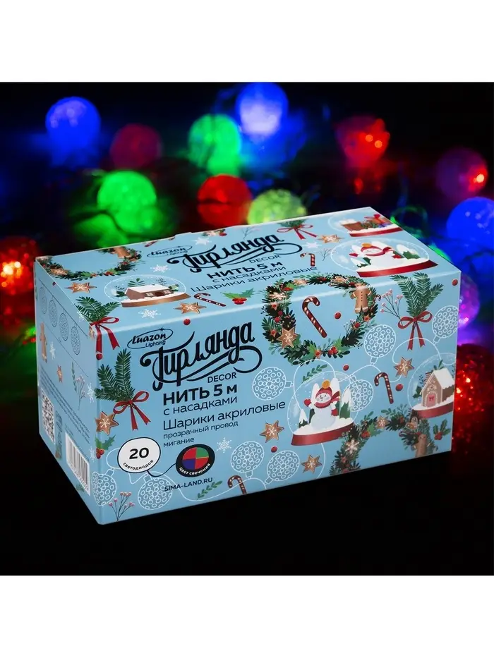 Гирлянда «Нить» 5 м с насадками «Шарики акриловые», IP20, прозрачная нить, 20 LED, свечение мульти (RG/RB), мигание, 220 В