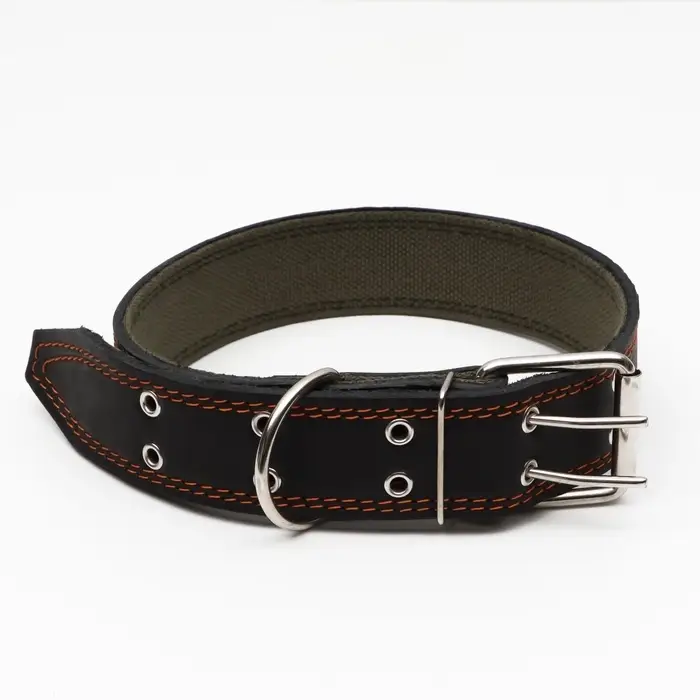 Наш кожаный ошейник обшит брезентом с внутренней стороны.
