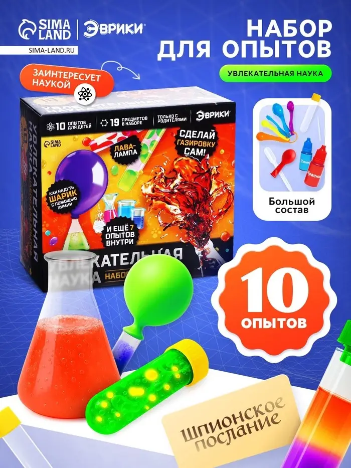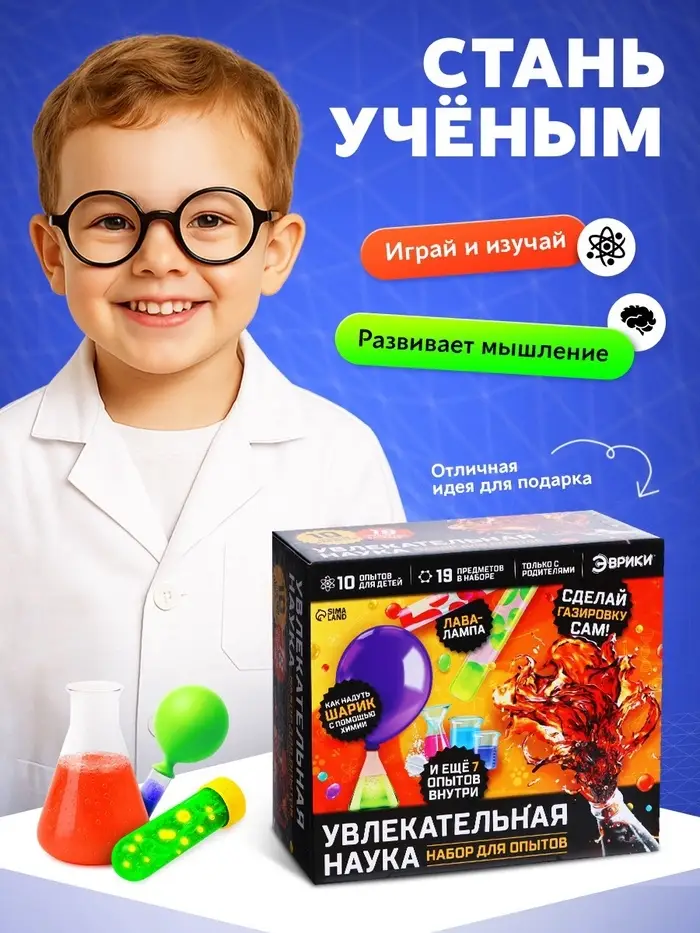 С набором для опытов «Эврики» ребёнок узнает об удивительных свойствах химии, проведёт 10 увлекательных экспериментов дома и удивит своих друзей.