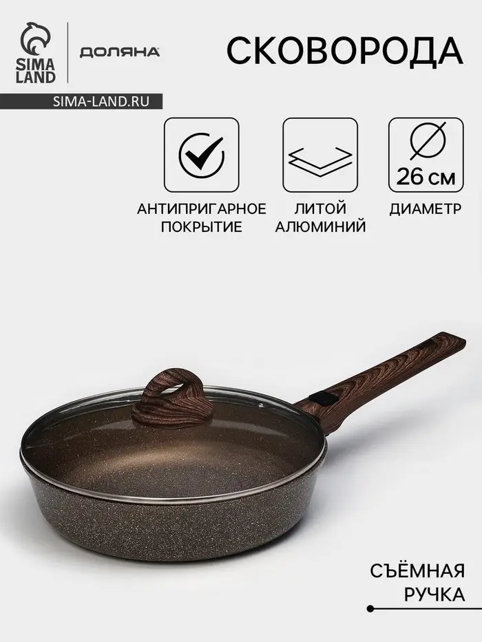 Сковорода Доляна «Брауни», d=26 см, съёмная ручка, стеклянная крышка, антипригарное покрытие, индукция, алюминий, коричневая