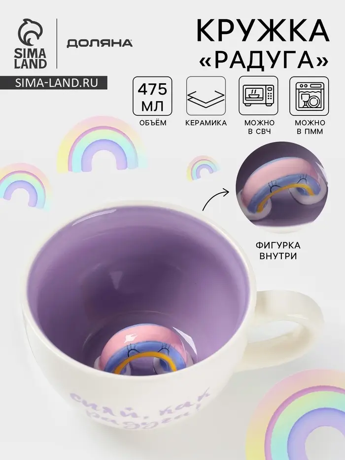 Яркая керамическая кружка большого объема (475 мл) в нежных бело-сиреневых тонах. Внутри – милая фигурка, а снаружи – вдохновляющая надпись «Сияй как радуга!». Идеальный подарок для тех, кто верит в себя и не боится быть собой. Можно использовать в микроволновой печи и посудомоечной машине.