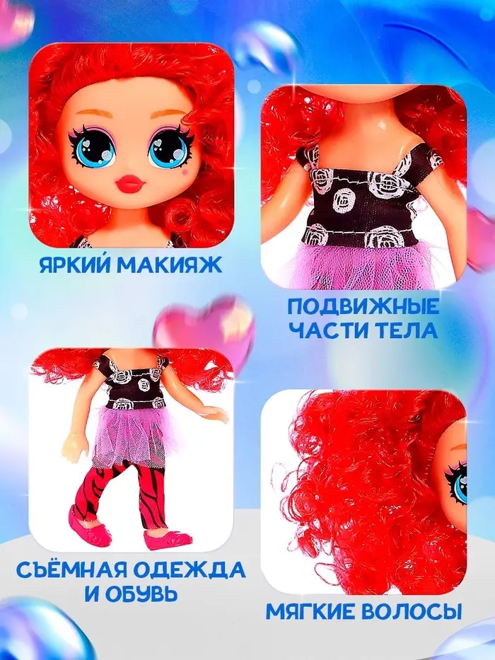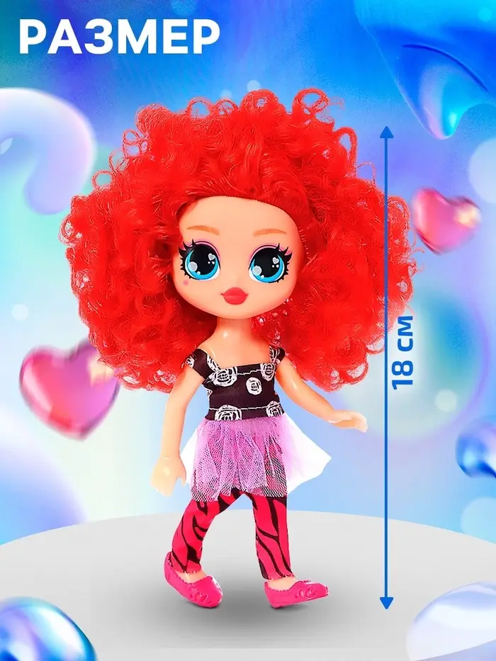 - Кукла высотой 18 см с кудрявыми яркими красными локонами, которые можно расчёсывать и создавать стильные причёски.