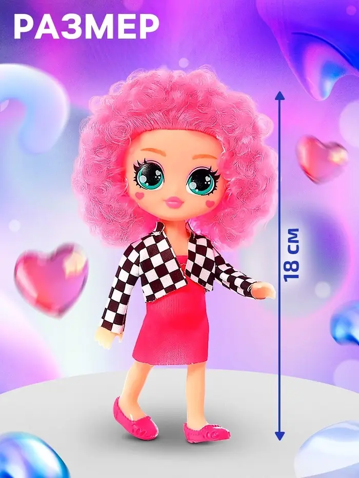 - Кукла высотой 18 см с кудрявыми ярко-розовыми локонами, которые можно расчёсывать и создавать стильные причёски.
