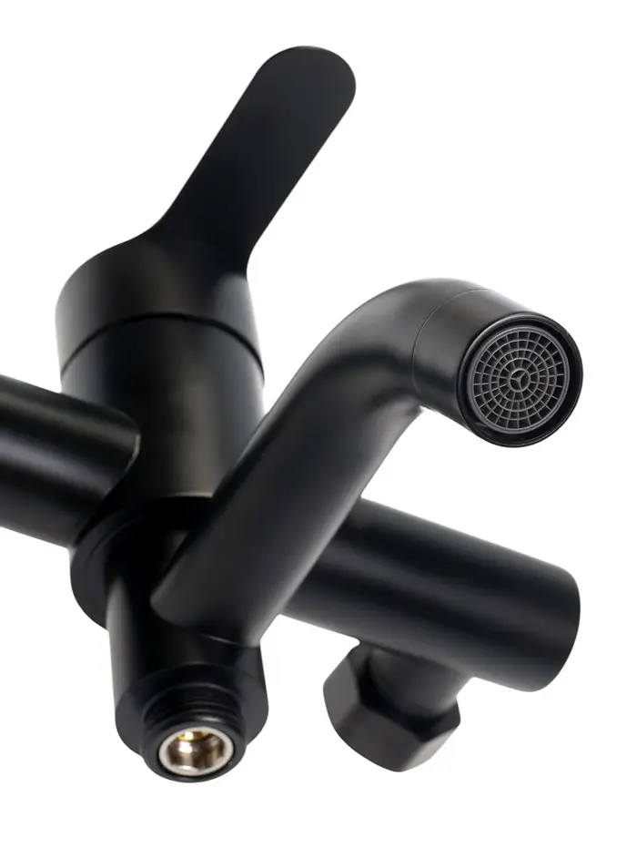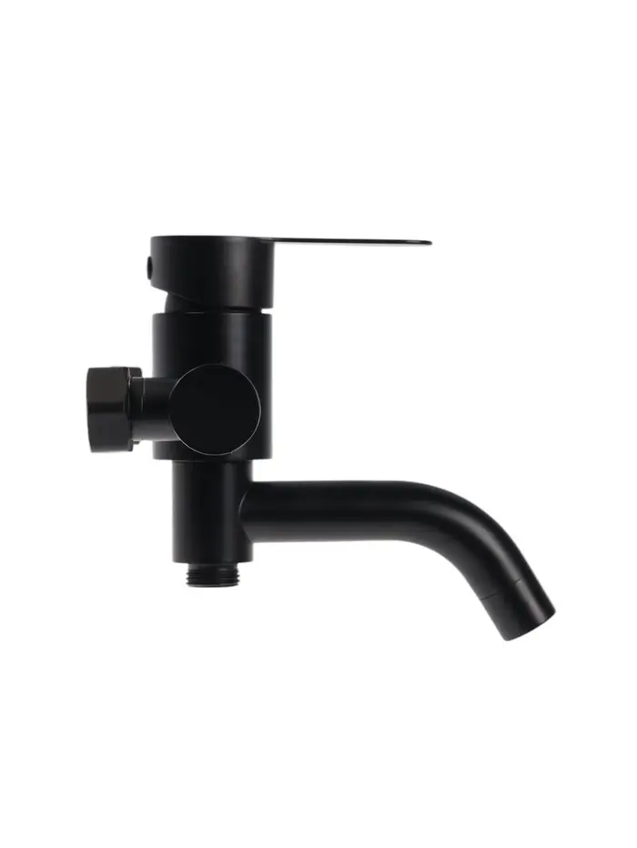 Черный настенный смеситель для ванны в интерьерном исполнении подает воду через изогнутый излив и душевую лейку. Монолитный корпус из нержавеющей стали устойчив к механическим воздействиям.