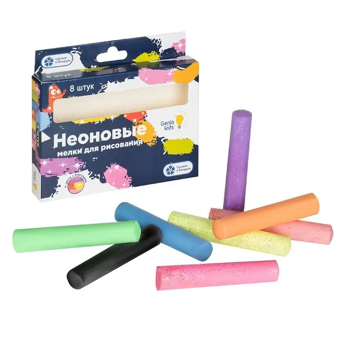 - В наборе 8 разноцветных мелков неоновых цветов, 4 из них с блёстками.
