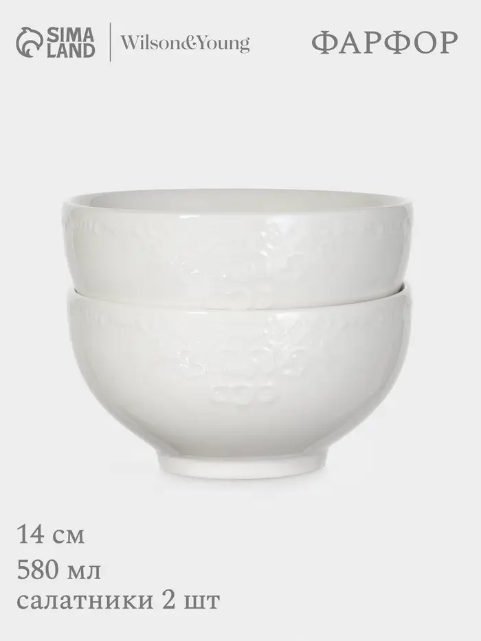 Представляем вам набор из двух белых фарфоровых салатников объемом 580 мл каждый. Салатники выполнены из нового костяного фарфора с рельефной текстурой и барельефом, придающим им особый шарм. Подходят для подачи салатов, закусок и других блюд. Можно использовать в микроволновой печи и мыть в посудомоечной машине.
