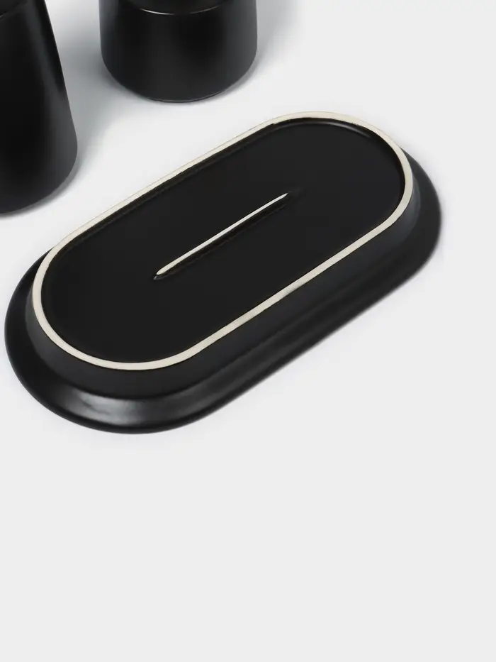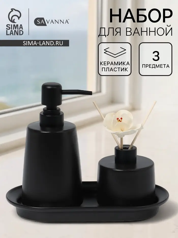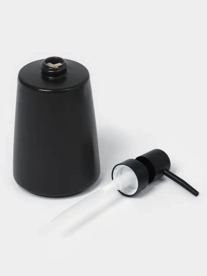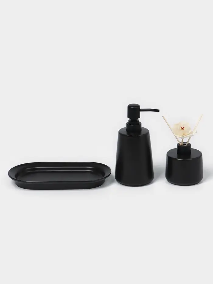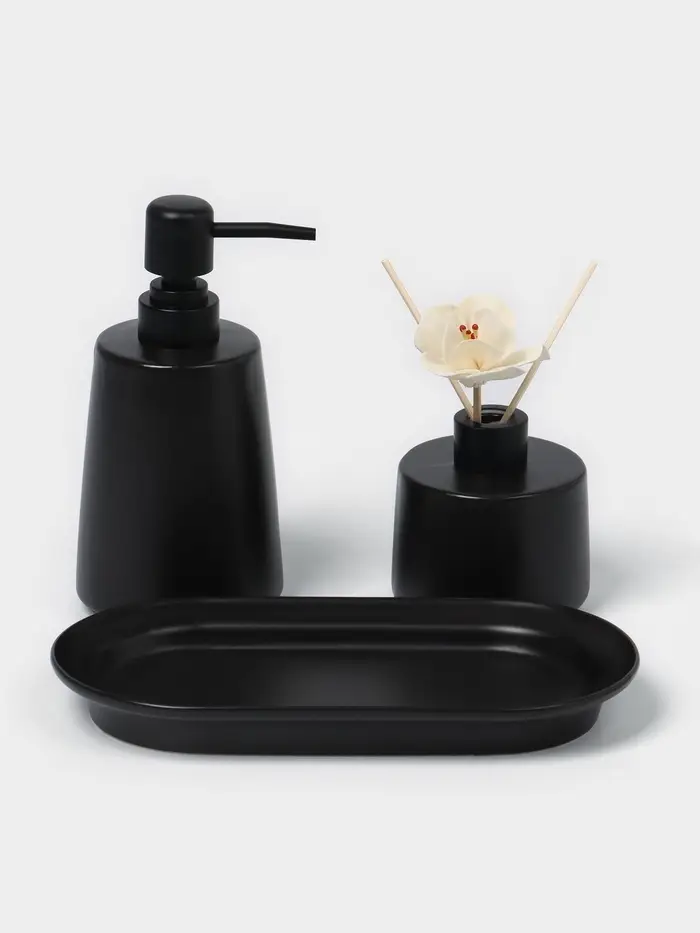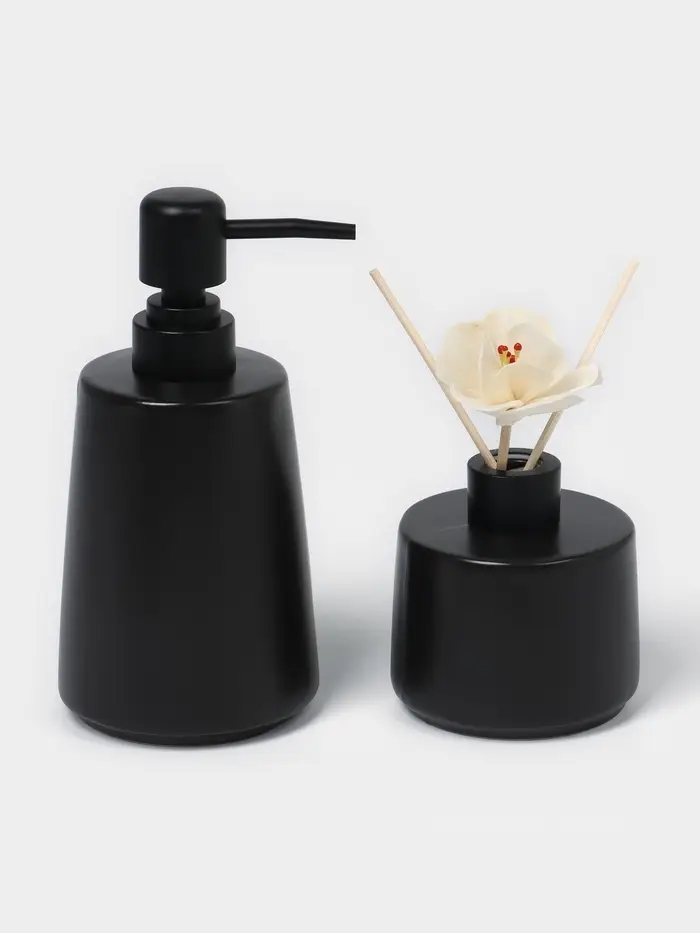 Керамический дозатор и диффузор на подставке в чёрном цвете станет стильным и функциональным дополнением интерьера. Этот набор из трёх предметов идеально подходит для создания уютной атмосферы в доме или офисе. Минималистичный дизайн без рисунков и однотонная тематика делают его универсальным решением для любого стиля оформления.