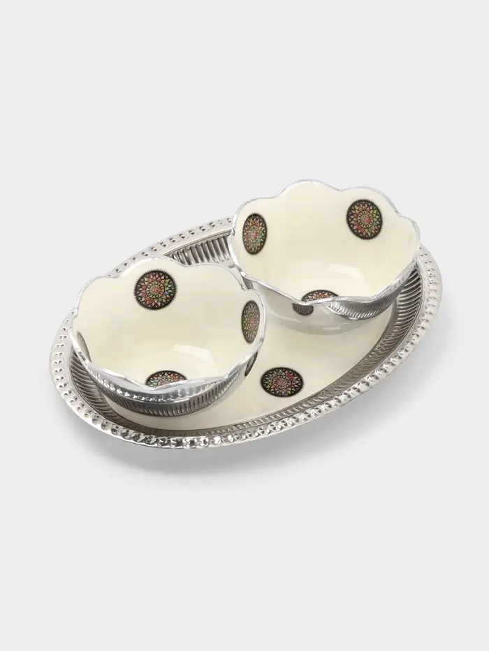 - Удобная композиция из двух форм: В набор входят две разные менажницы — овальная и фигурная. Их можно использовать вместе на подносе или по отдельности. Это позволяет разделить соленые и сладкие закуски, соусы или орехи, сохраняя порядок на столе.