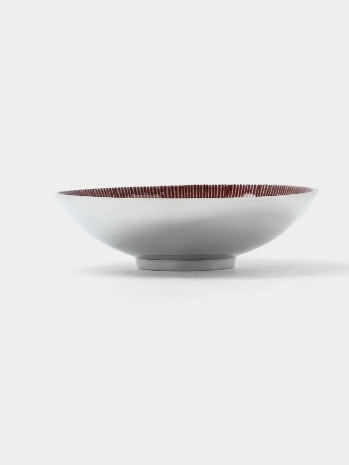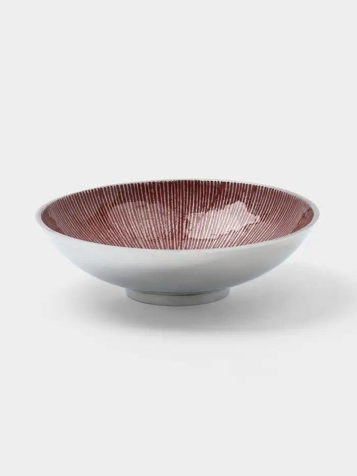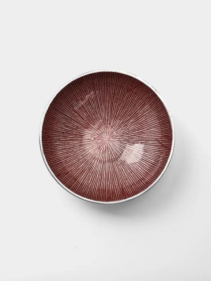 Элегантность ручной работы для вашего стола. Круглое алюминиевое блюдо с бордовым узором — это стильная сервировочная посуда, созданная для особых моментов. Его глубокая форма и уникальный дизайн превращают подачу закусок, десертов или фруктов в небольшое произведение искусства.