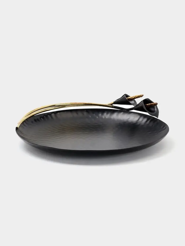 - Выразительный дизайн с фигуркой: Объёмный цветок чёрной каллы из латуни, украшенный золотым покрытием, застыл в изящном изгибе на краю блюда. Эта художественная деталь делает подачу любого угощения — от канапе до десертов — запоминающейся и стильной.
