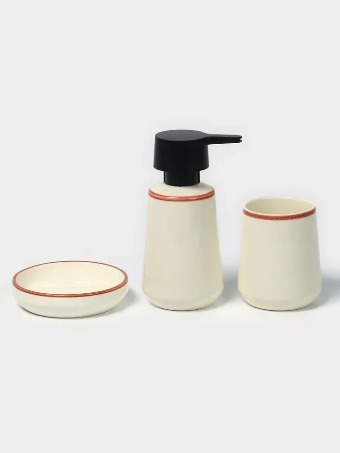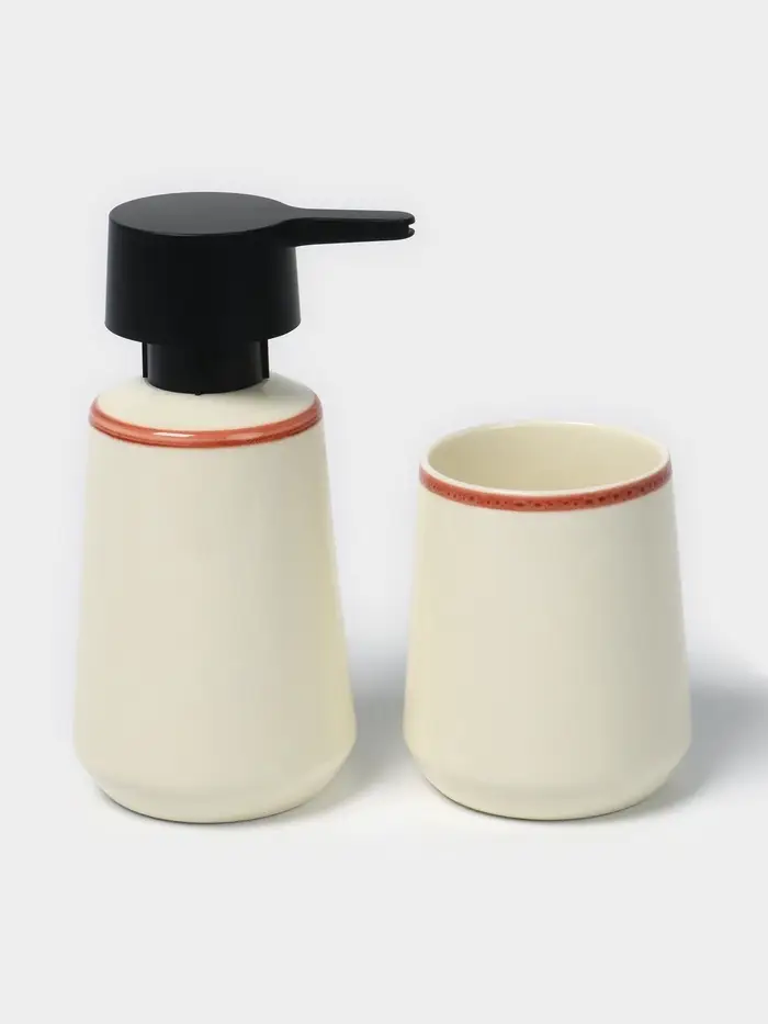 - Функциональный набор: включает дозатор для жидкого мыла, стакан для зубных щёток и мыльницу — всё необходимое для комфортного использования.