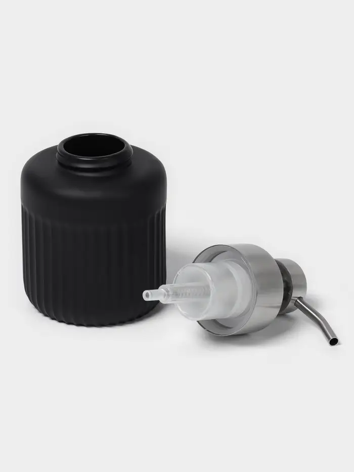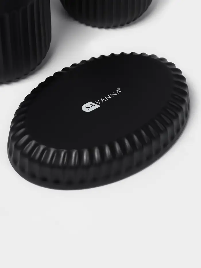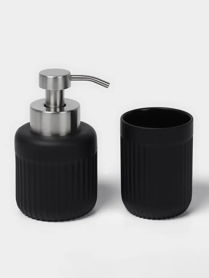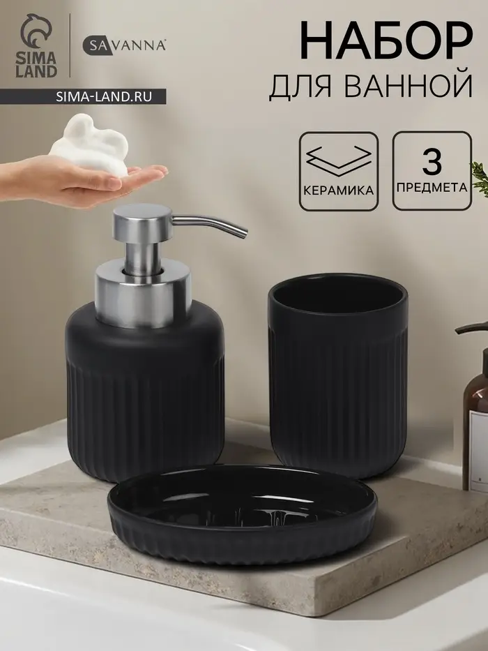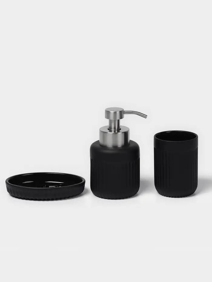 Погрузитесь в атмосферу уюта и стиля с набором, который преобразит вашу ванную комнату. Этот комплект из трёх предметов, выполненный в элегантном чёрном цвете, станет настоящим украшением интерьера. Каждый элемент набора — дозатор для мыла, стакан и мыльница — изготовлен из высококачественной керамики, что гарантирует долговечность и устойчивость к воздействию влаги.