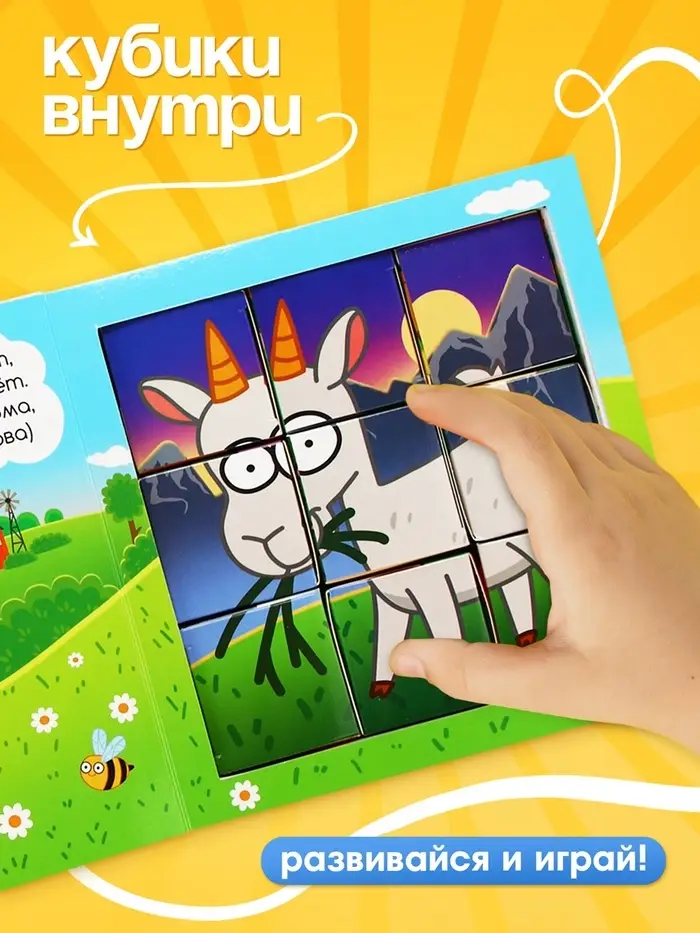 - Комплект включает книжку на 10 страниц и 9 кубиков для сборки.