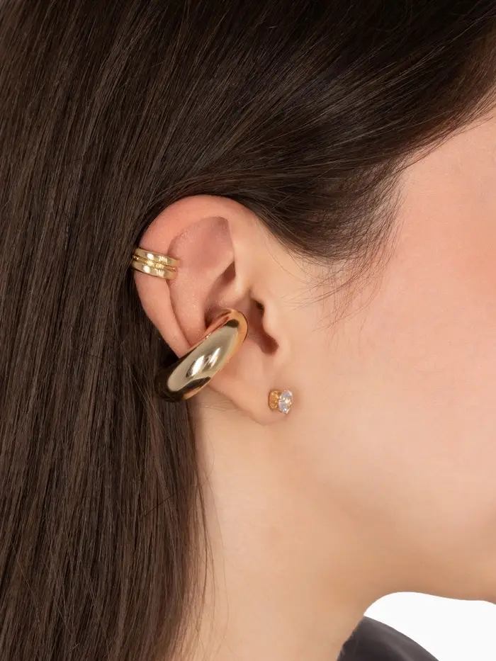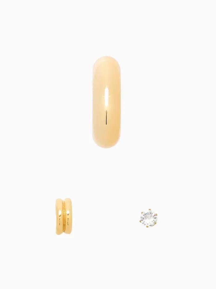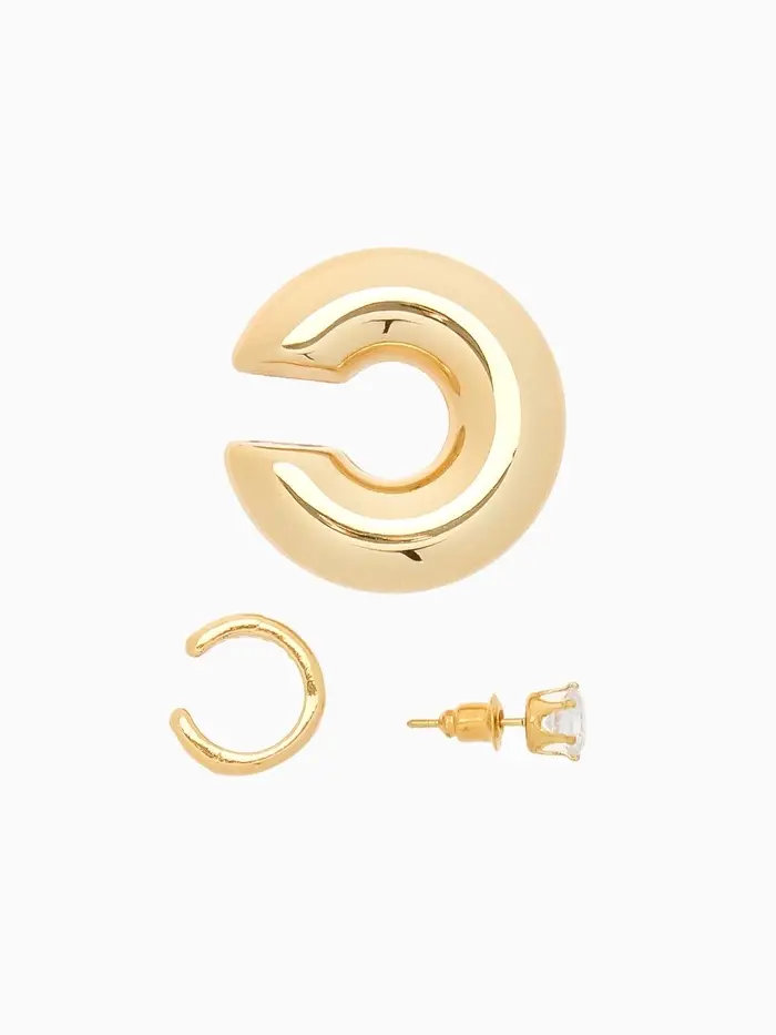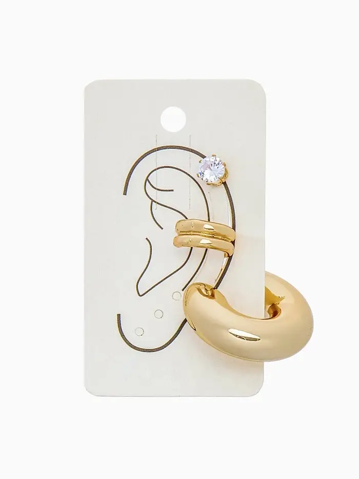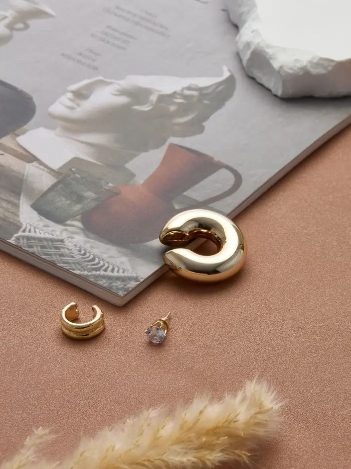 Откройте для себя очарование этих изысканных серьг и каффов, которые объединяют в себе стиль и утонченность. Набор из трёх украшений в золотистом цвете с эффектом бублика и стразы — идеальное решение для создания элегантного образа, который привлечёт внимание и подчеркнёт вашу индивидуальность.
