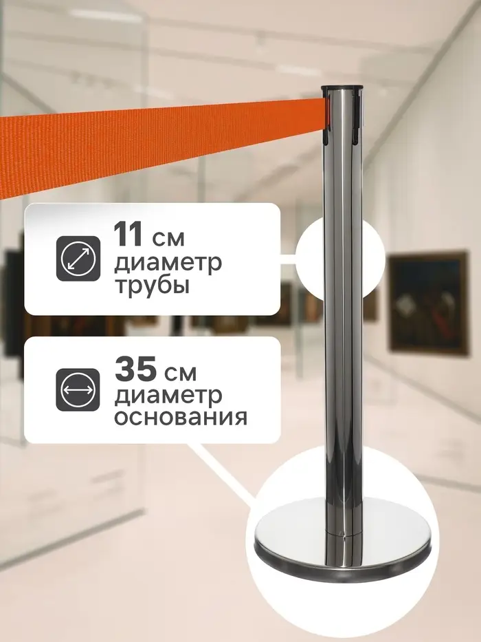 Стойка ограждения серебряная, с вытяжной лентой - 470 см оранжевая, высота-90 см, d=11 см, напольный d=35 см