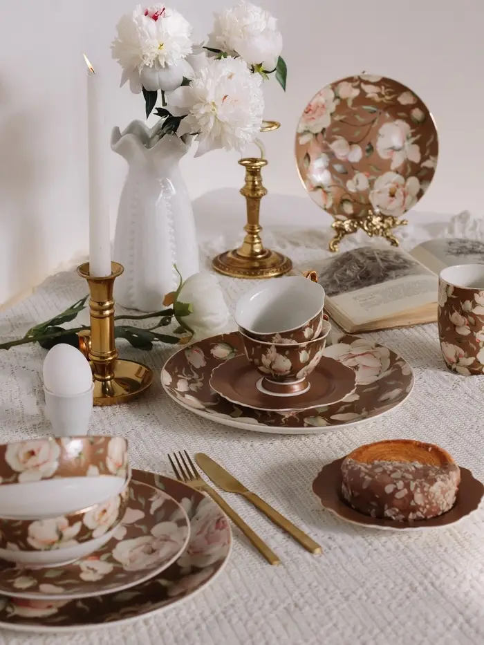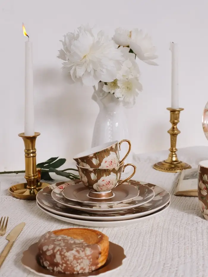 - Чайный комплект на одного: включает чашку и блюдце, формируя элегантный и законченный образ.