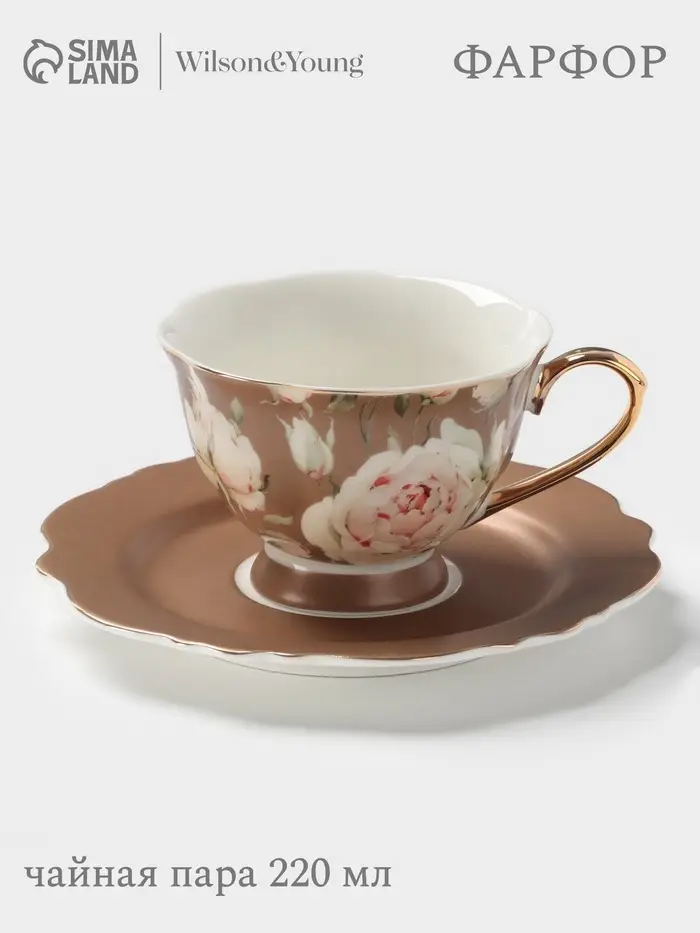 Окунитесь в атмосферу гармонии и комфорта с этой изысканной бежевой чайной парой из фарфора, украшенной нежным цветочным рисунком.