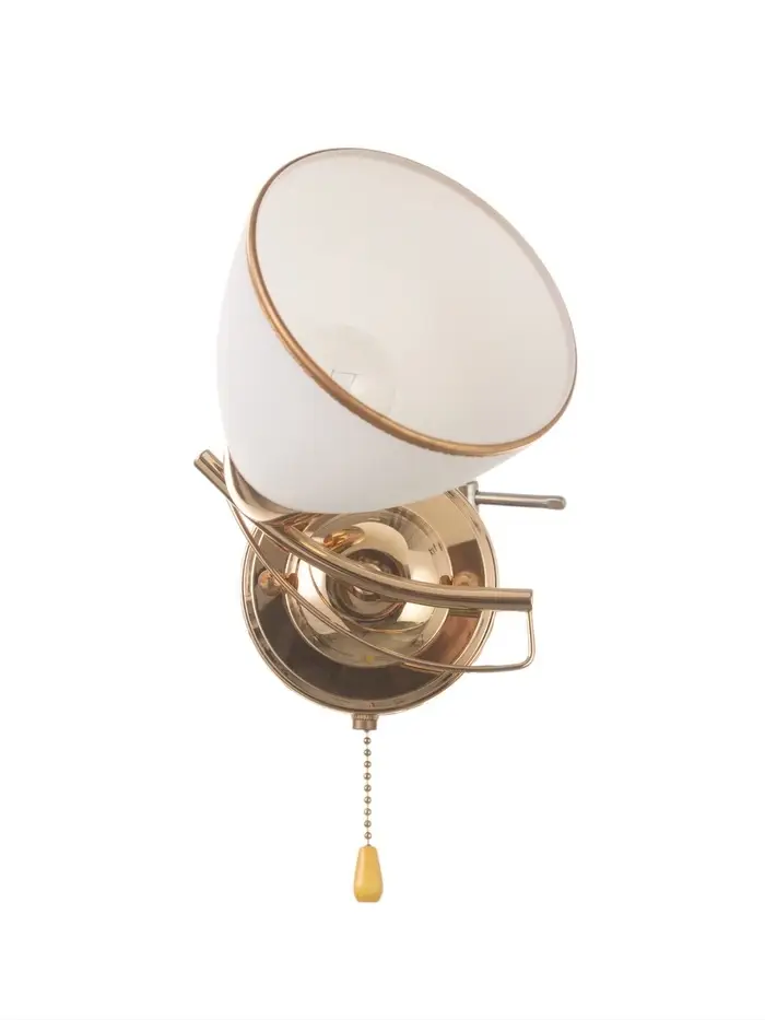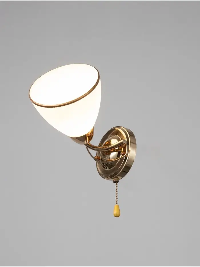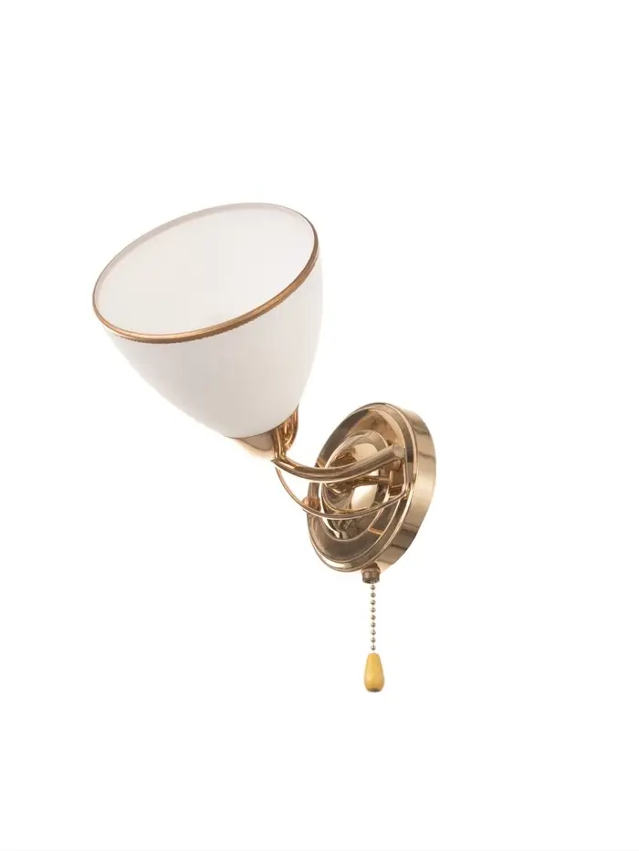 Представляем вам настенный бра, который станет изысканным дополнением вашего интерьера. Светильник выполнен в классическом стиле и идеально впишется в спальню или гостиную. Основание бра выполнено из металла золотого цвета, что придает ему элегантный и роскошный вид. Плафон, выполненный в белом и золотом цветах, мягко рассеивает свет, создавая уютную атмосферу.