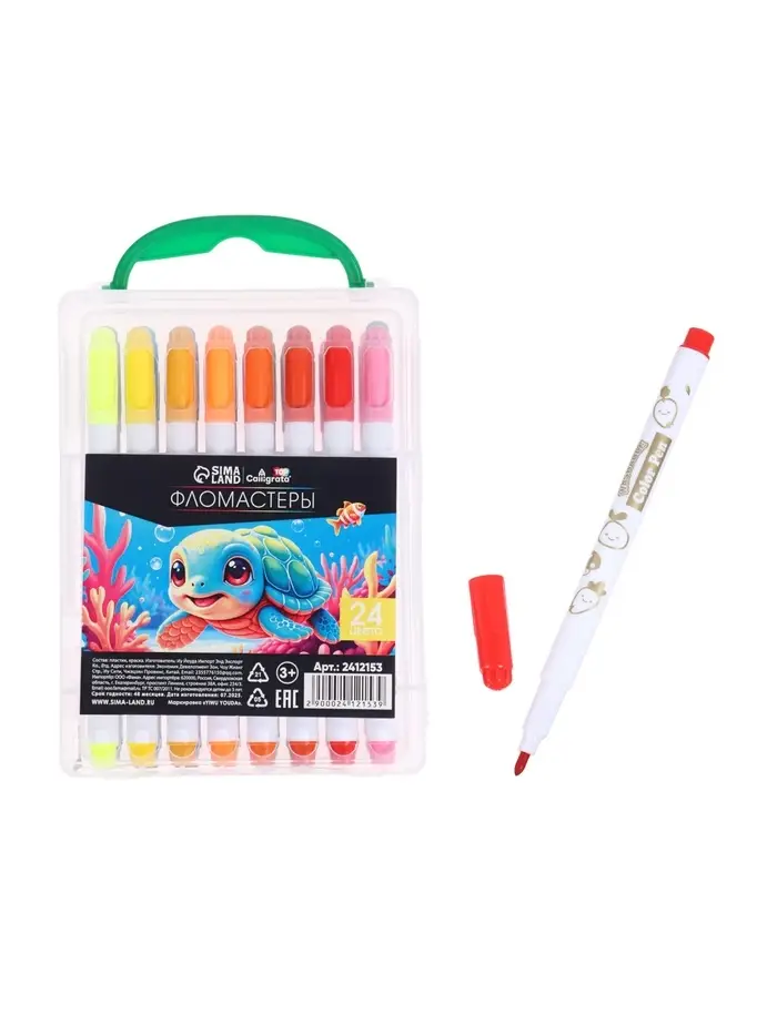 Набор фломастеров "Мышка" содержит 24 ярких и сочных цветов. Вентилируемый колпачок. Идеально подходят для детей от 3-х лет и для тех, кто только начинает свой творческий путь. Фломастеры удобные и приятные на ощупь. Упаковка представлена в пластиковом пенале с ручкой. Фломастеры состоят из пластика и чернил. Благодаря фломастерам "Мышка" Вы сможете воплотить все свои творческие фантазии в реальность.